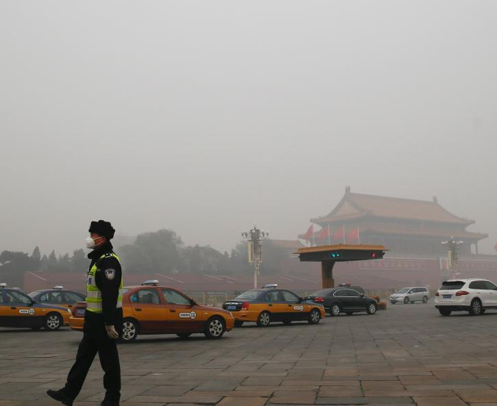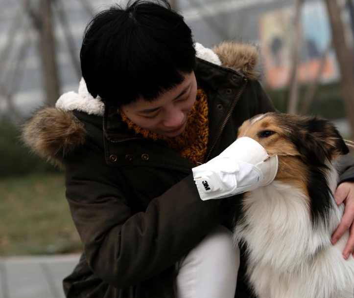 11月30日,北京现空气重污染过程,街头一位遛狗的市民为爱犬戴上自制的防霾口罩,据她介绍,爱犬的肺较弱,自制犬用防霾口罩,在雾霾天中加强防护。北京市空气重污染应急指挥部29日宣布将本市空气重污染预警由黄色升级为橙色。这是自今年3月31日《北京市空气重污染应急预案》修订后,首次启动橙色级别的预警,也是今年首个空气重污染橙色预警。