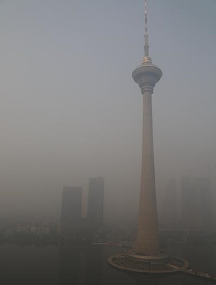 天津天空被“面纱”笼罩,远处的楼房“若隐若现”。