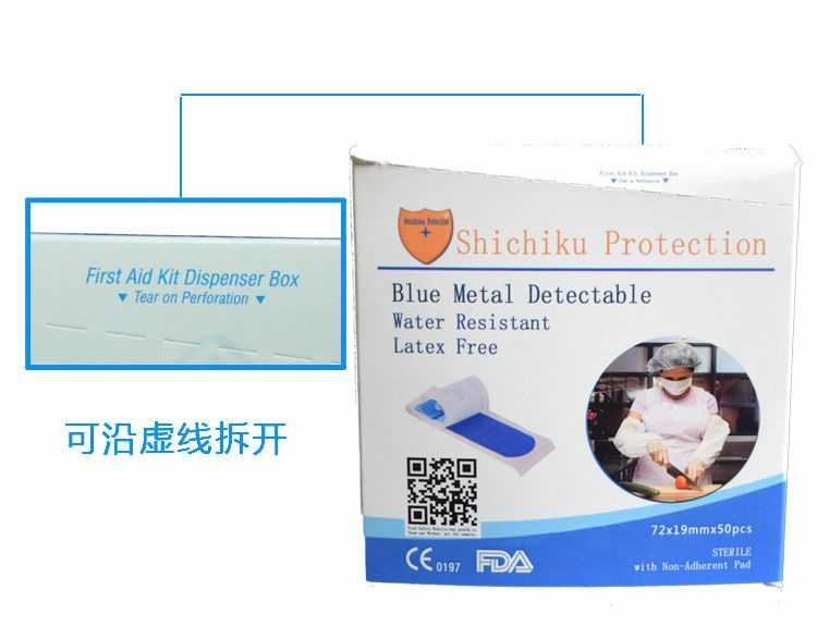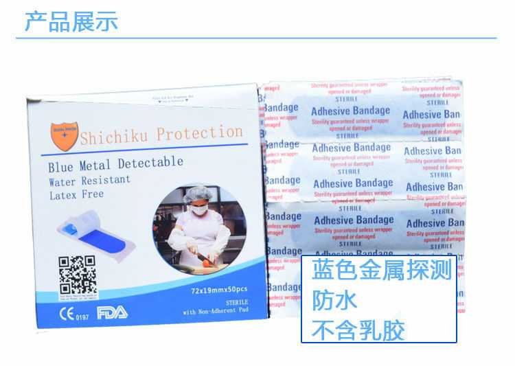 为了适应食品歺饮企业开发研制了蓝色金属可探测创可贴,符合FDA CE0197标准!