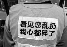 “有时候刚扫完地,结果又有人乱扔垃圾,加大工作量。”4月4日上午,正在工作的环卫工陈满英介绍,她的制服上写的是“抽刀断水水更流,乱扔垃圾愁更愁”。对此,陈满英称,“这些标语写出了我们的心声。”