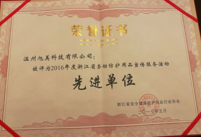 会上,温州旭美科技有限公司被评为“2016年浙江省劳动防护用品宣传服务活动先进单位”,项总表示,企业发展离不开过硬的产品质量,先进的管理理念和与时俱进的宣传意识,与业内专业平台的合作不仅仅提高了企业产品的知名度,更是将旭美旗下“大盾”、“利玫”的品牌产品推荐给更多有需要的劳动者,荣誉将激励旭美,更好的前行。