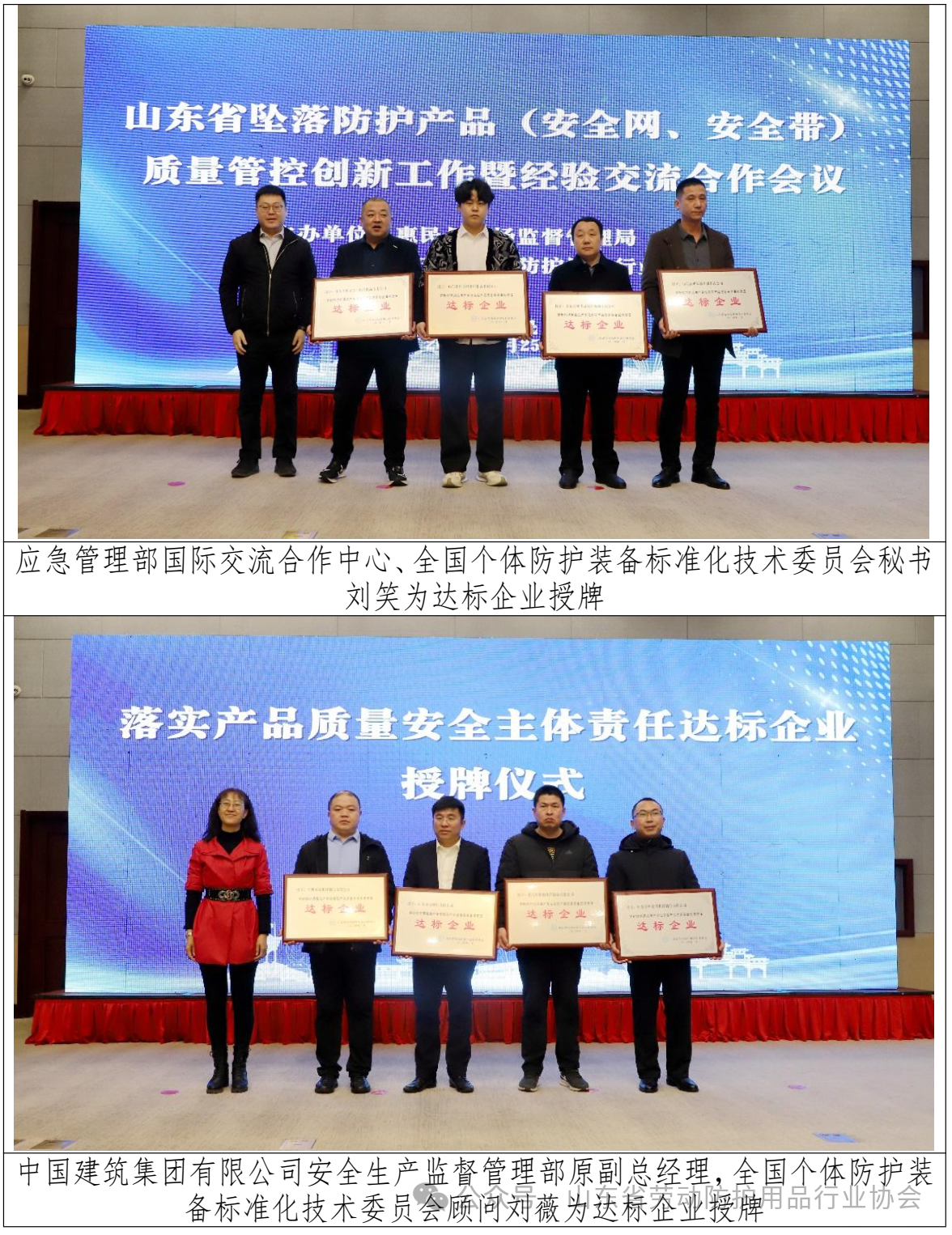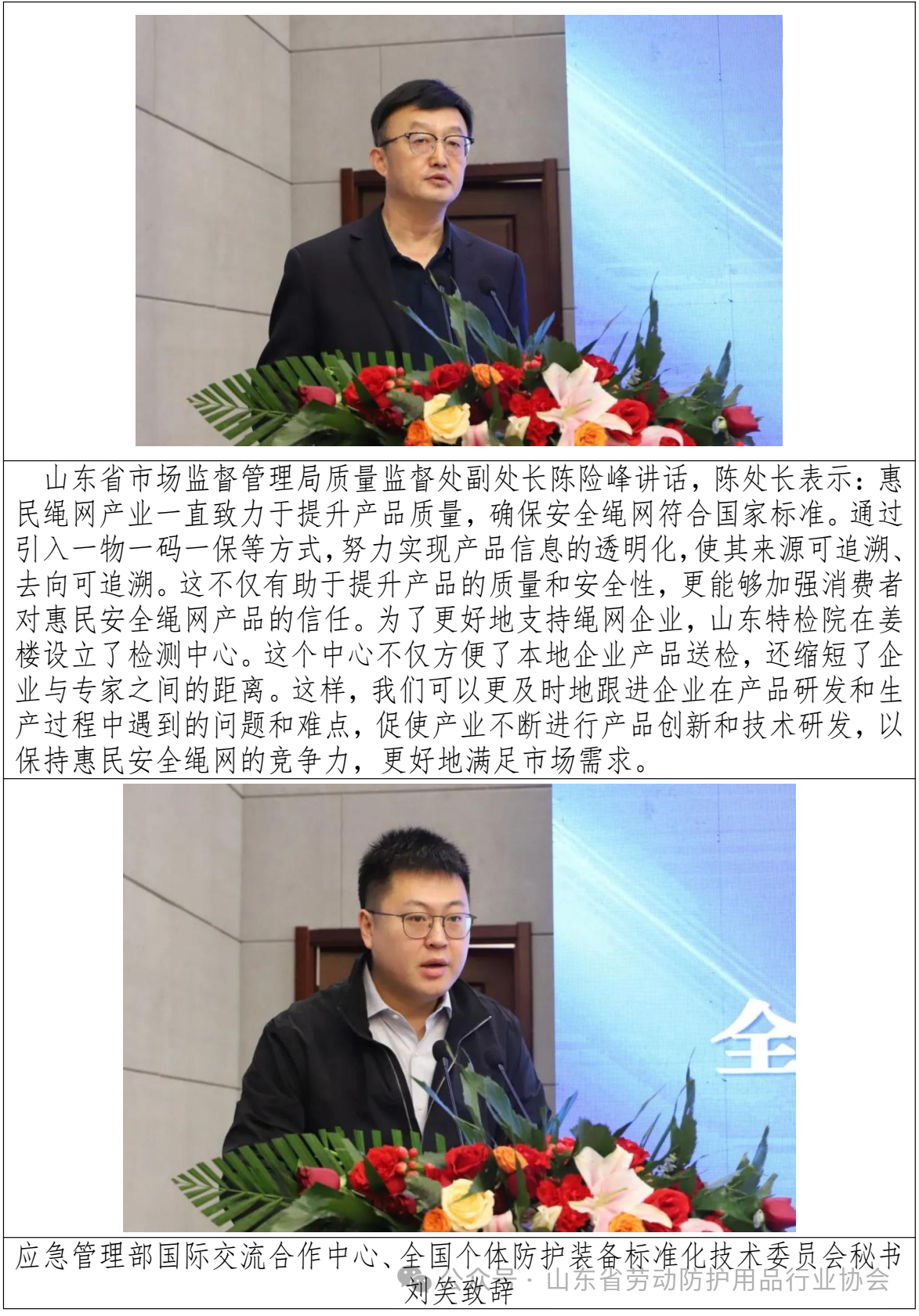 2024年1月25日,由惠民县市场监督管理局和山东省劳动防护用品行业协会共同主办的“山东省坠落防护产品质量管控创新工作及经验交流合作会议”在惠民县召开。旨在总结前期产品质量管控方面所取得的阶段性成果,通过培育达标企业,树立品牌典型,集中多方力量共同打造优质产业基地,带动绳网带产业健康恒稳发展。